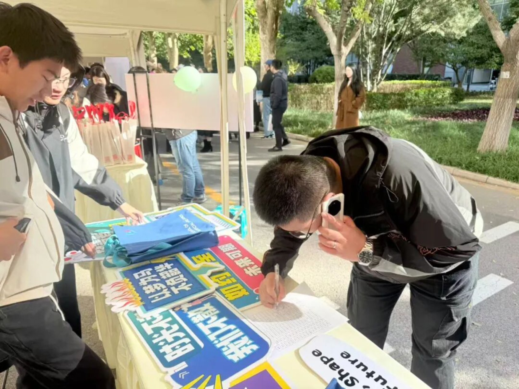 校友们早早来到签到点报到,在展位前合影留念。