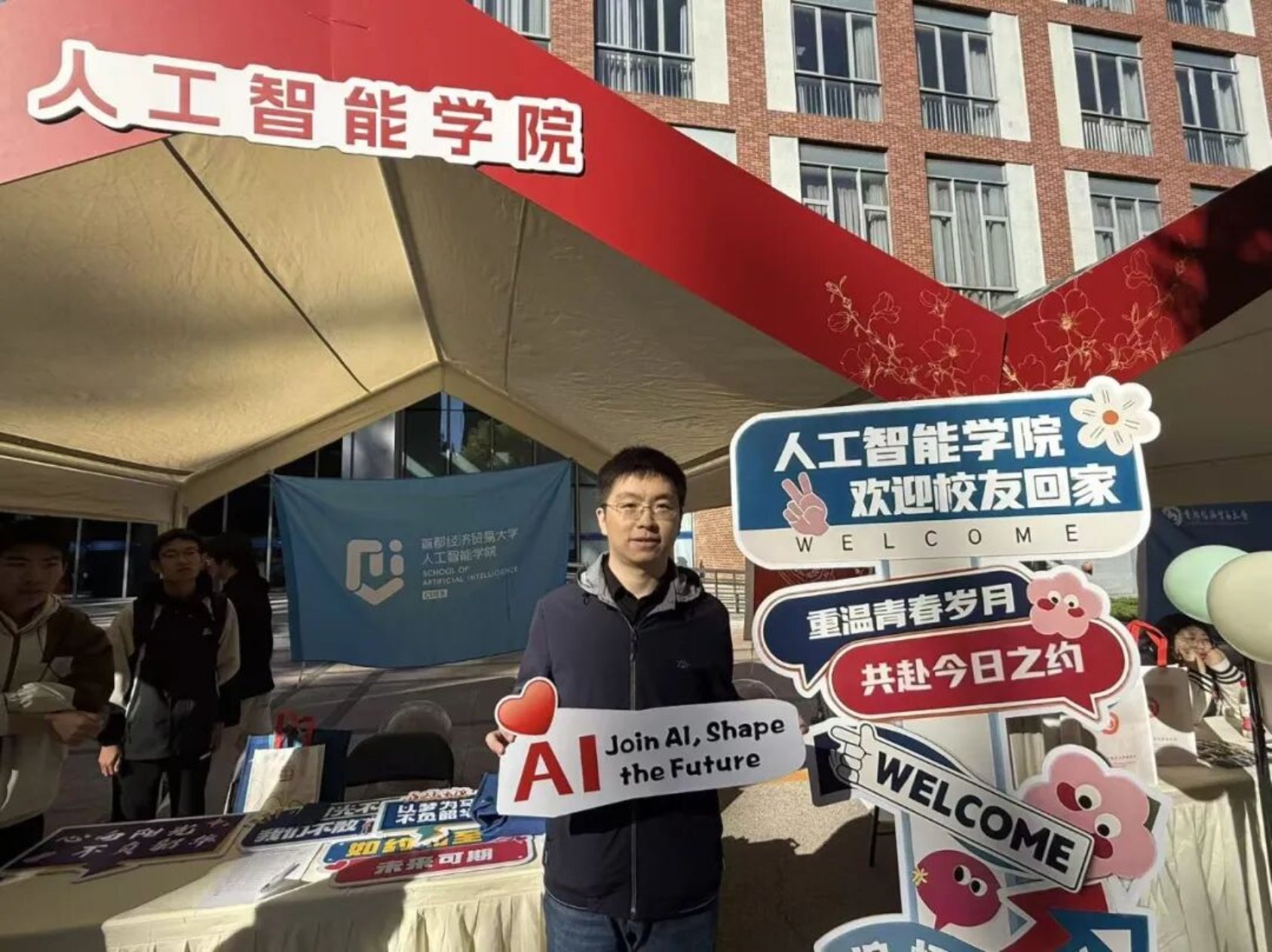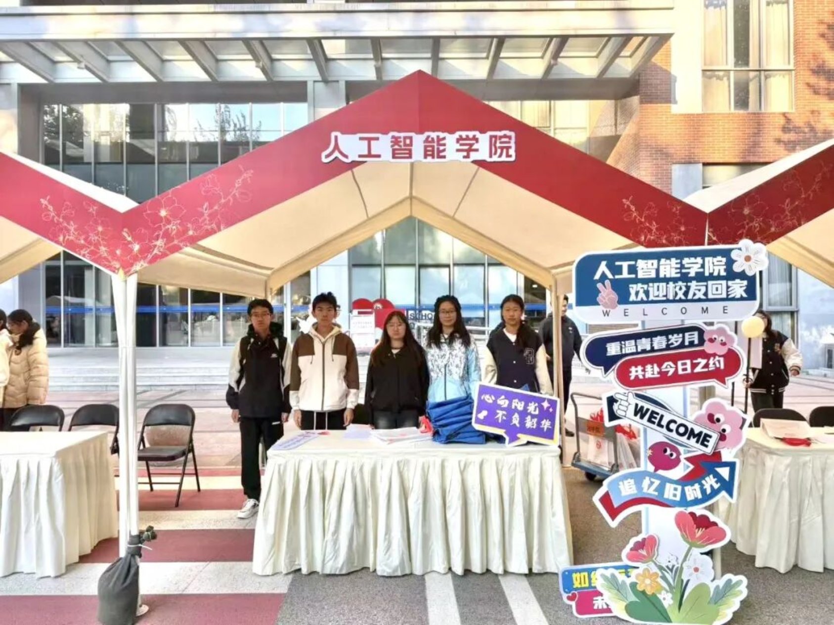 清晨,人工智能学院学生志愿者精心布置报到点,以饱满的热情迎接每一位回家的校友。