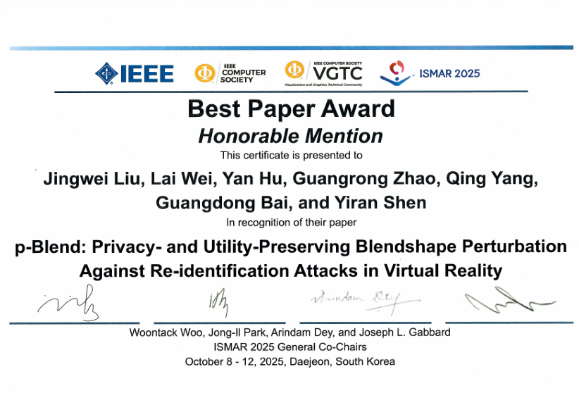 我院青年教师杨青参与发表的论文“p-Blend: Privacy- and Utility-Preserving Blendshape Perturbation Against Re-identification Attacks in Virtual Reality”在国际会议IEEE International Symposium on Mixed and Augmented Reality(IEEE ISMAR 2025)荣获“最佳论文提名”。IEEE ISMAR是增强现实,混合现实和虚拟现实领域的顶级国际学术会议之一。该论文的合作者为山东大学软件学院沈益冉教授团队。