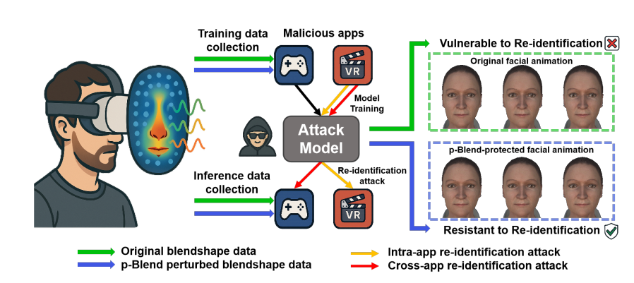 该论文提出名为 p-Blend 的混合形状扰动机制,专门针对 VR 设备向第三方应用传输混合形状数据时的安全隐患,可有效抵御设备内及跨应用的身份重识别攻击。p-Blend 在设计上兼顾隐私防护与实用价值,既通过扰动混合形状数值构建安全屏障,又能精准保留面部动画的流畅性与表情自然度,确保数据使用不受影响。经大规模数据集实验与用户研究验证,该机制能显著降低多种机器学习模型的重识别准确率,相比纯随机扰动,更能有效应对利用统计特征的攻击,为虚拟现实领域的隐私保护提供了高效可行的解决方案。