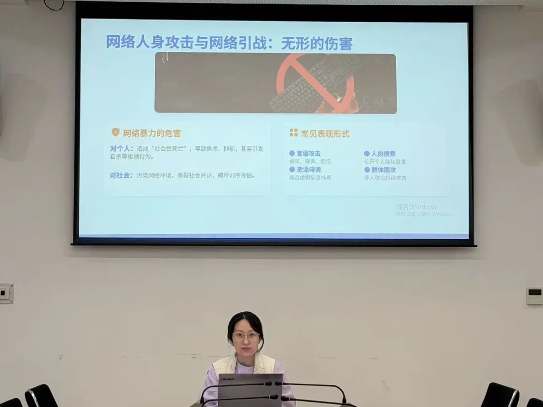 学院层面主题团课上,团组织书记黄茹茜面向全体团支书开展培训,结合其工作实际,分析网络工作困境,梳理网络谣言、恶意引战的类型及危害,明确要求团支书恪守法纪校规、牢记网络“七不原则”,切实将学院的网络素养要求传达给每一位同学,引领学生规范网络言行。