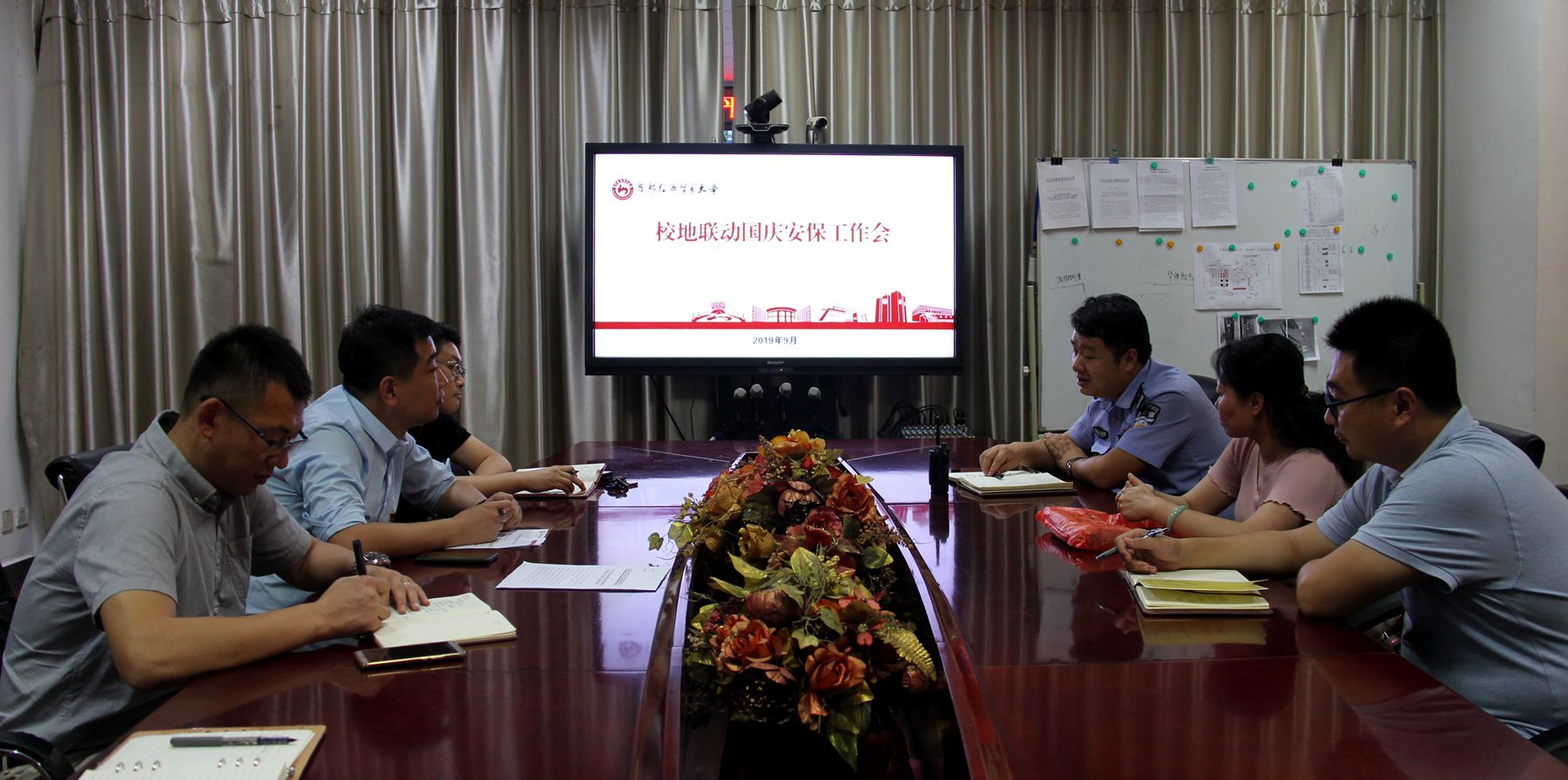 为确保新中国成立70周年庆祝活动和国庆期间的校园安全稳定,9月29日下午,校本部和红庙校区分别联系属地相关单位召开校地联动工作联席会,会商研判国庆期间校园周边安全形势,共同部署相关安保工作。保卫处长卢萌、副处长贾学森分别代表两校区安保工作队伍与属地派出所、街道等单位负责人开展交流,校地双方互相就近期工作进行了研判和部署,表示要充分发挥校地联动工作机制的优势,全力确保国庆期间校园安全稳定。