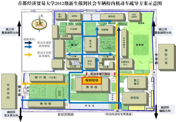 (三)为保证报到现场安全,2012年9月1日、2日6:00至16:00首经贸中路博学楼楼北侧路段禁止机动车通行。校园北区道路按顺时针方向单向通行(详见后附2012级新生报到社会车辆校内机动车疏导方案示意图)。