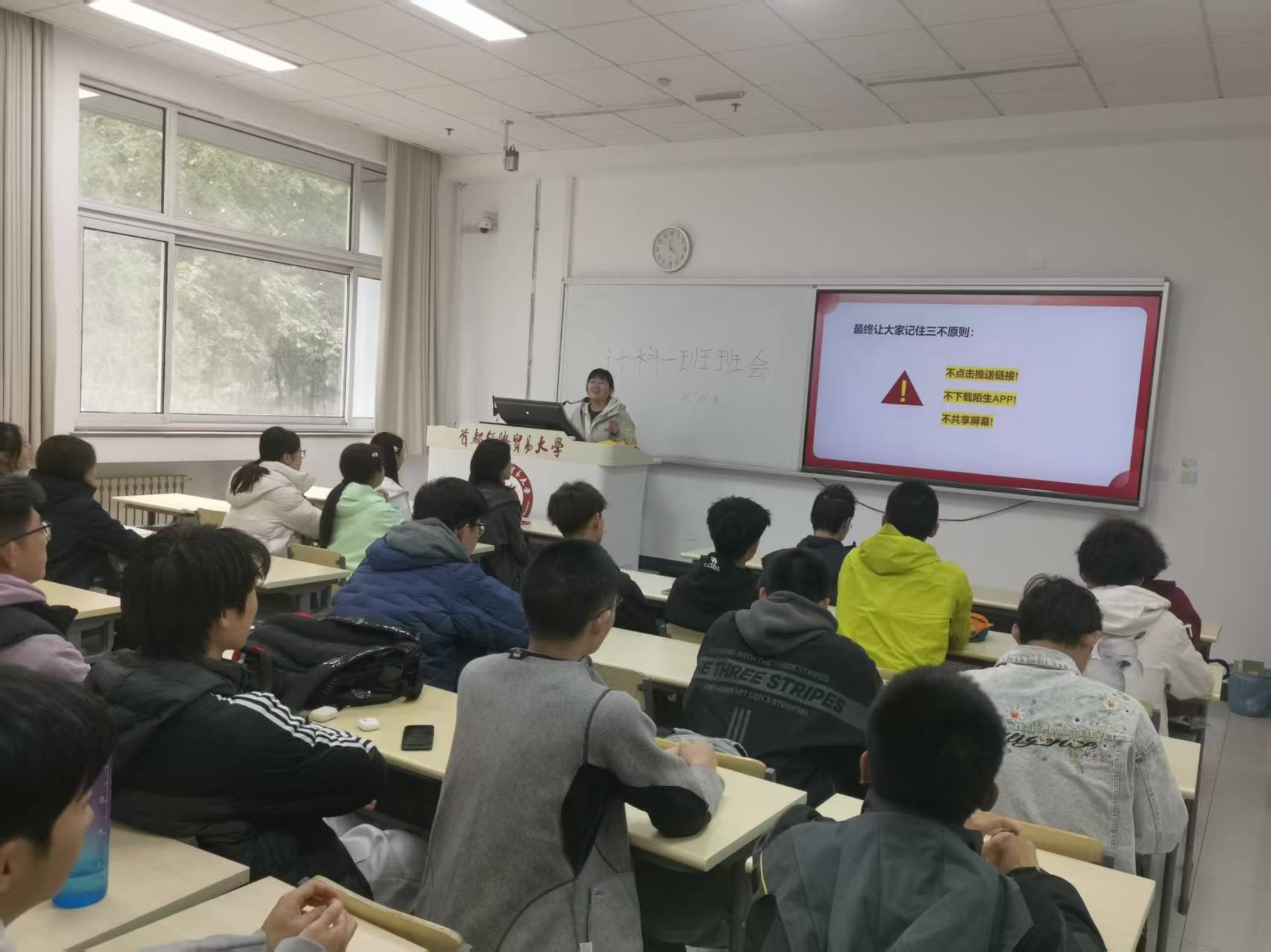 各班班主任通过法规解读与政策宣讲,让同学们深刻认识到反诈不仅是个人安全需求,更是维护社会稳定的责任,为后续学习筑牢思想基础。班主任向全体同学发出反诈倡议,号召大家牢固树 “防范为先” 的安全意识:一方面主动关注 “国家反诈中心” APP、校园反诈专栏等平台,持续学习反诈知识;另一方面积极参与校园反诈宣传活动,通过班级群分享、主题板报创作等方式,向身边同学、家人普及防骗技巧,争当反诈“宣传员”与“守护者”。同时,班会明确要求同学们严格践行反诈“三不原则”——不点击未知推送链接、不下载非官方陌生APP、不向他人共享手机或电脑屏幕,以“个人防线”织密“校园防护网”。